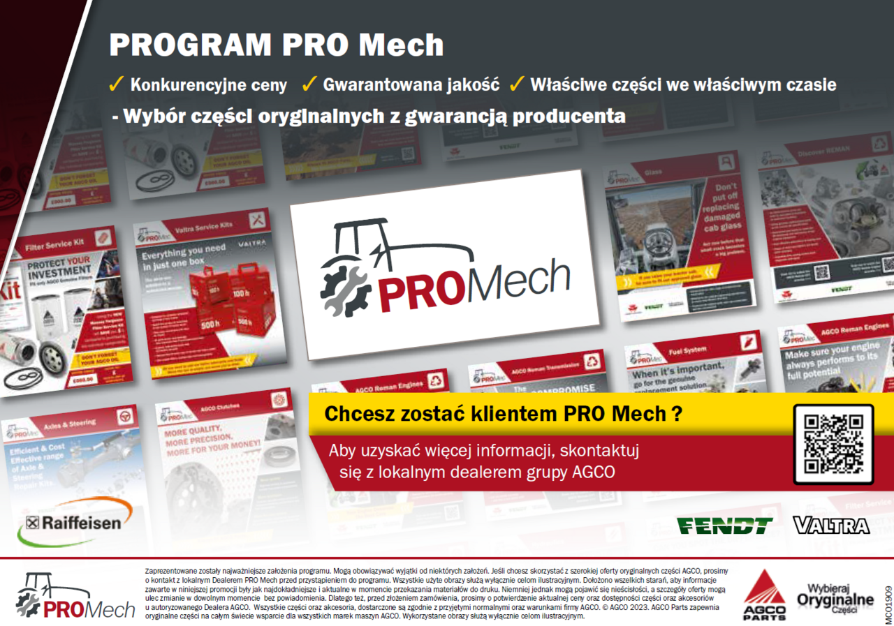 Dołącz do programu, zapewniając sobie ekskluzywne członkostwo, możliwość zakupu oryginalnych części AGCO po konkurencyjnych cenach i buduj silne relacje z autoryzowanymi Dealerem AGCO PRO Mech